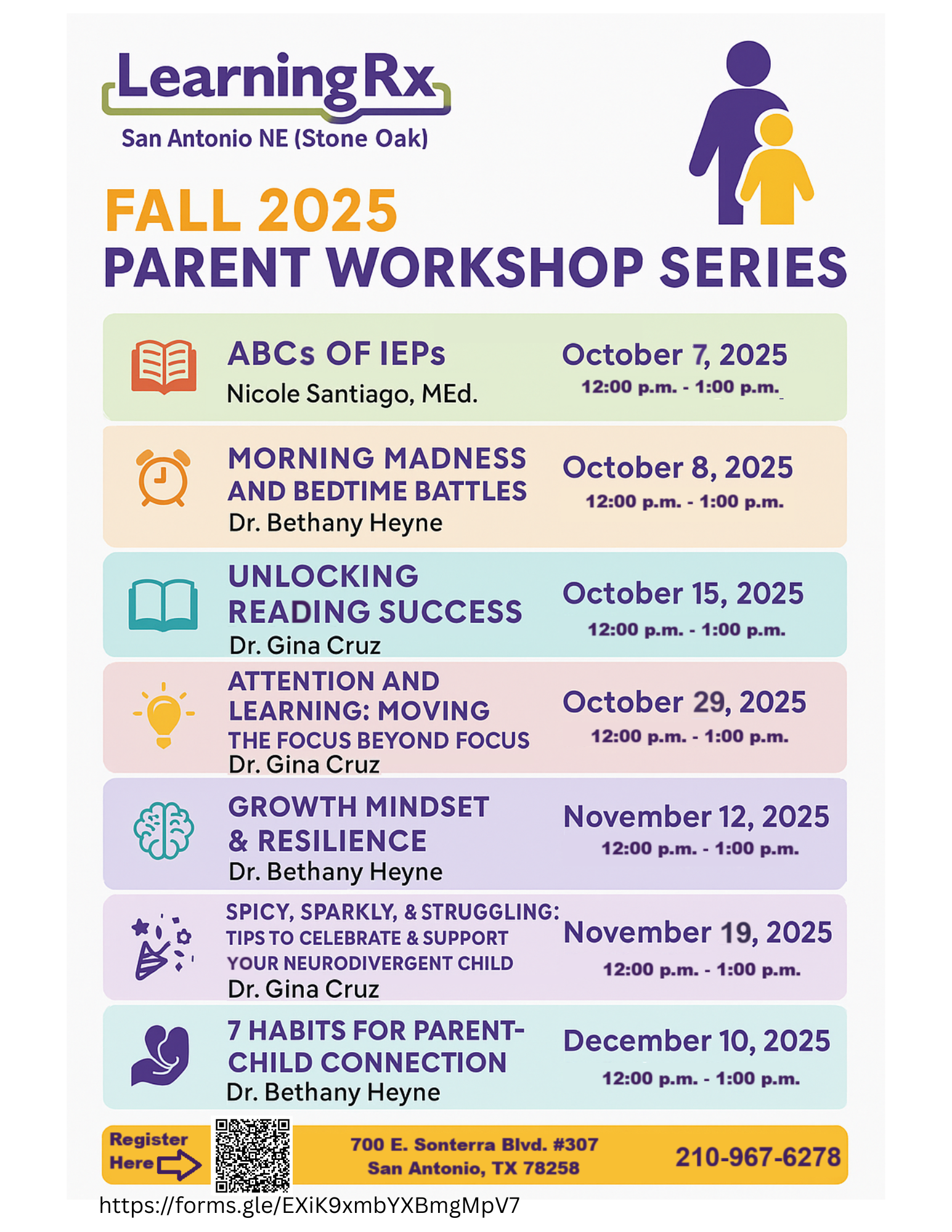 LearningRx San Antonio NE (Stone Oak) is offering a Fall 2025 Parent Workshop Series designed to equip parents with practical strategies and insights for supporting their children’s development. The series features seven one-hour workshops led by experienced educators, covering topics such as IEPs, sleep routines, reading skills, attention and focus strategies, growth mindset, neurodivergent children, and parent-child connection. Each workshop runs from 12:00 p.m. to 1:00 p.m. on select dates from October through December 2025, providing parents with expert guidance in a convenient format.